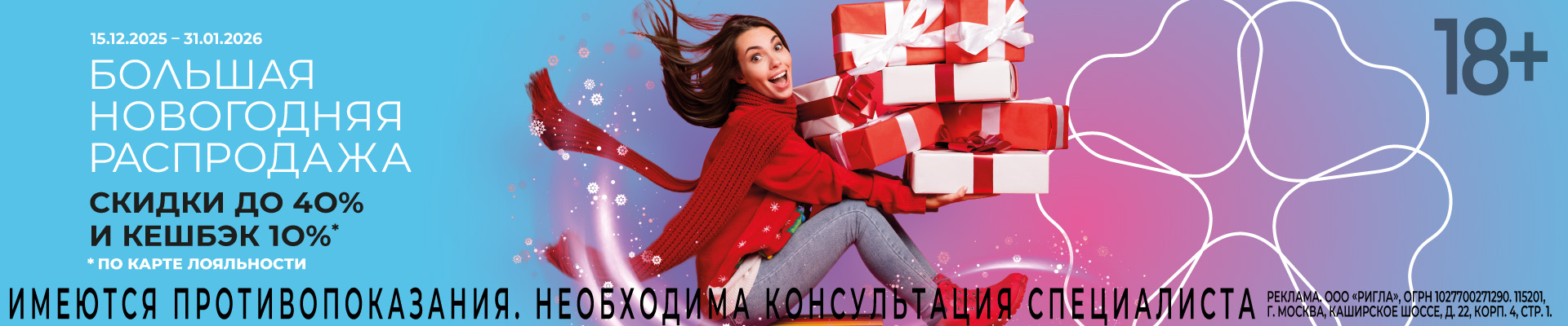 Акция проводится в период с 15.12.2025 по 31.01.2026 в аптеках бренда «Ригла». При применении карты лояльности на акционный ассортимент действует скидка до 40% и начисляется бонусами кешбэк 10%. 1 бонус = 1 рублю. Кешбэк – базовые бонусы, которые начисляются на карту лояльности клиента в рамках программы лояльности «Аптечная семья». Ассортимент акции, размер скидки в аптеках, на сайте и в мобильном приложении может отличаться. Подробные условия применения скидки указаны на сайте www.rigla.ru